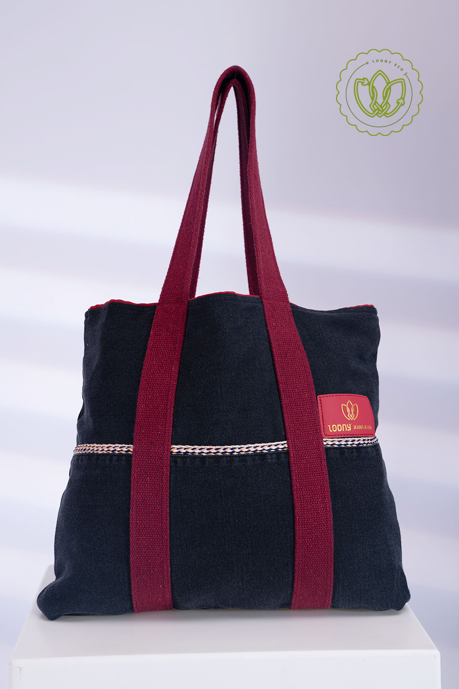 Tote em jeans escuro reaproveitado, com alças largas em tom bordeaux e faixa decorativa trançada no corpo. Upcycling elegante, resistente e ideal para a rotina.