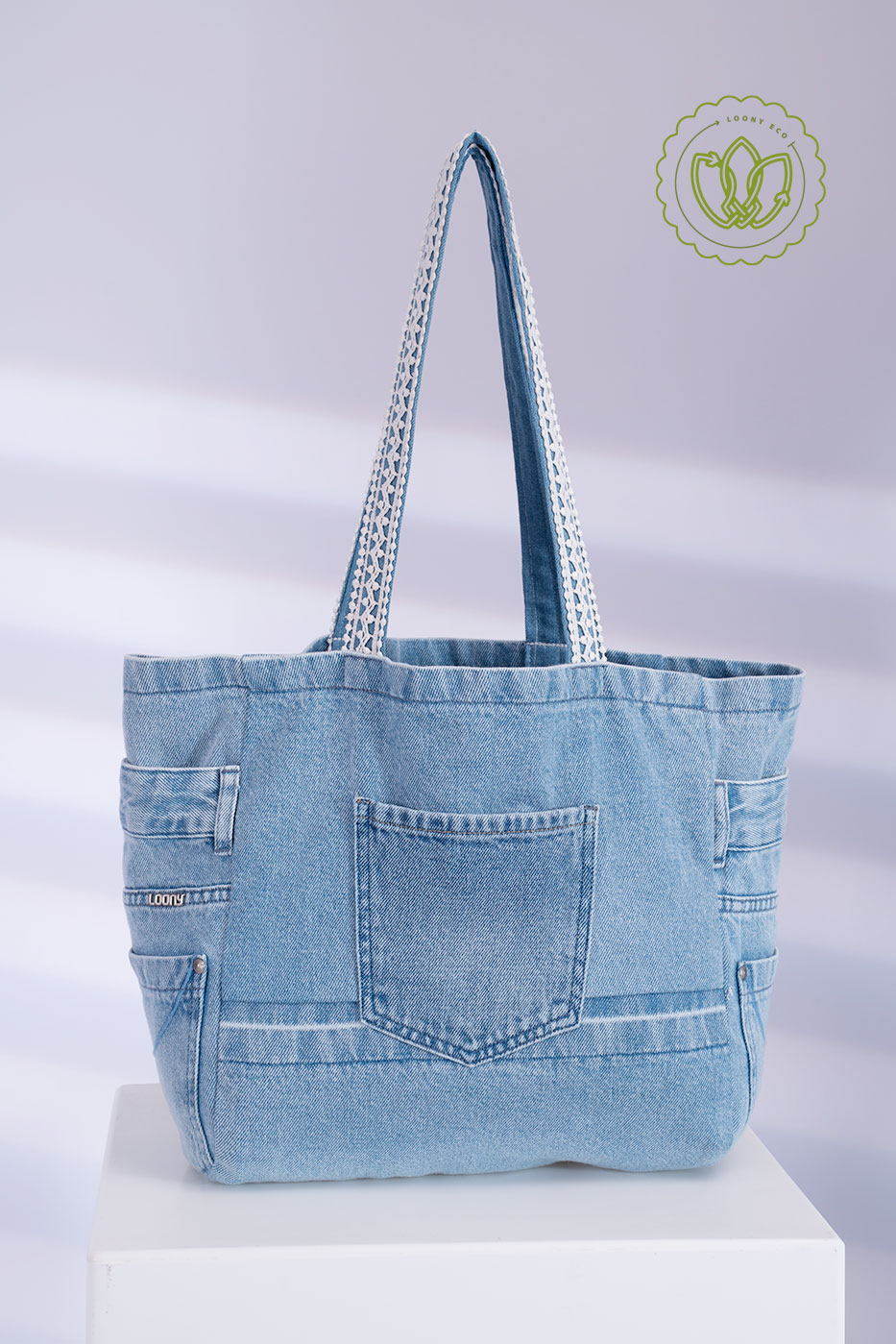 Shopper ampla em jeans de lavagem clara, com bolso frontal reaproveitado e alças com detalhe rendado. Feita por upcycling de resíduos de jeans, leve e resistente para a rotina.
