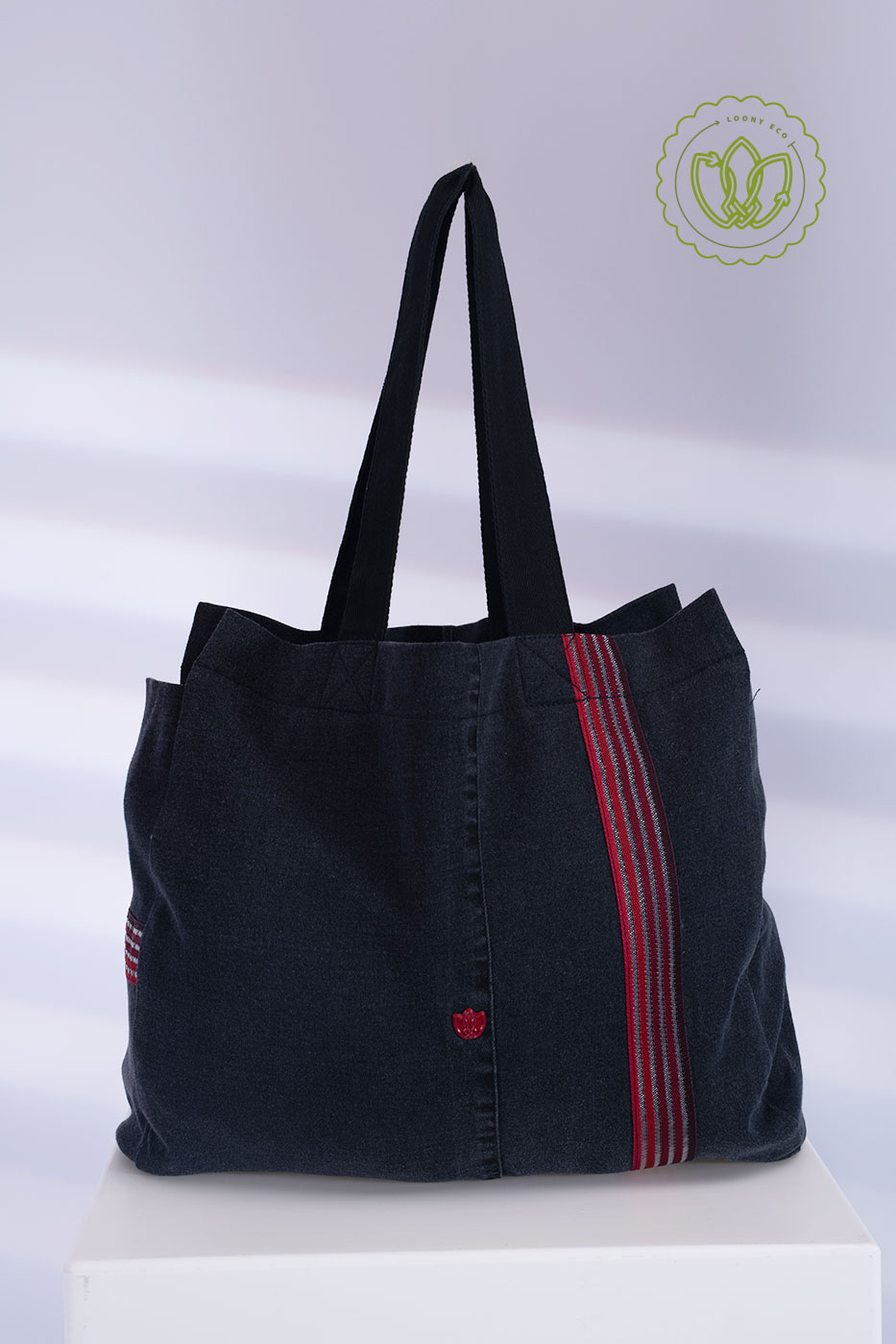 Tote em jeans escuro reaproveitado, com alças largas em tom bordeaux e faixa decorativa em espinha-de-peixe. Upcycling elegante, resistente e ideal para o dia a dia.