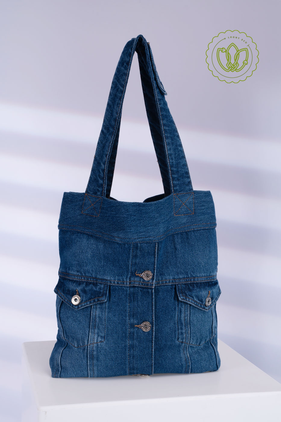 Bolsa estruturada feita a partir do recorte de jaqueta jeans — com botões frontais funcionais e bolsos com lapela. Upcycling autêntico, resistente e prático para o dia a dia.