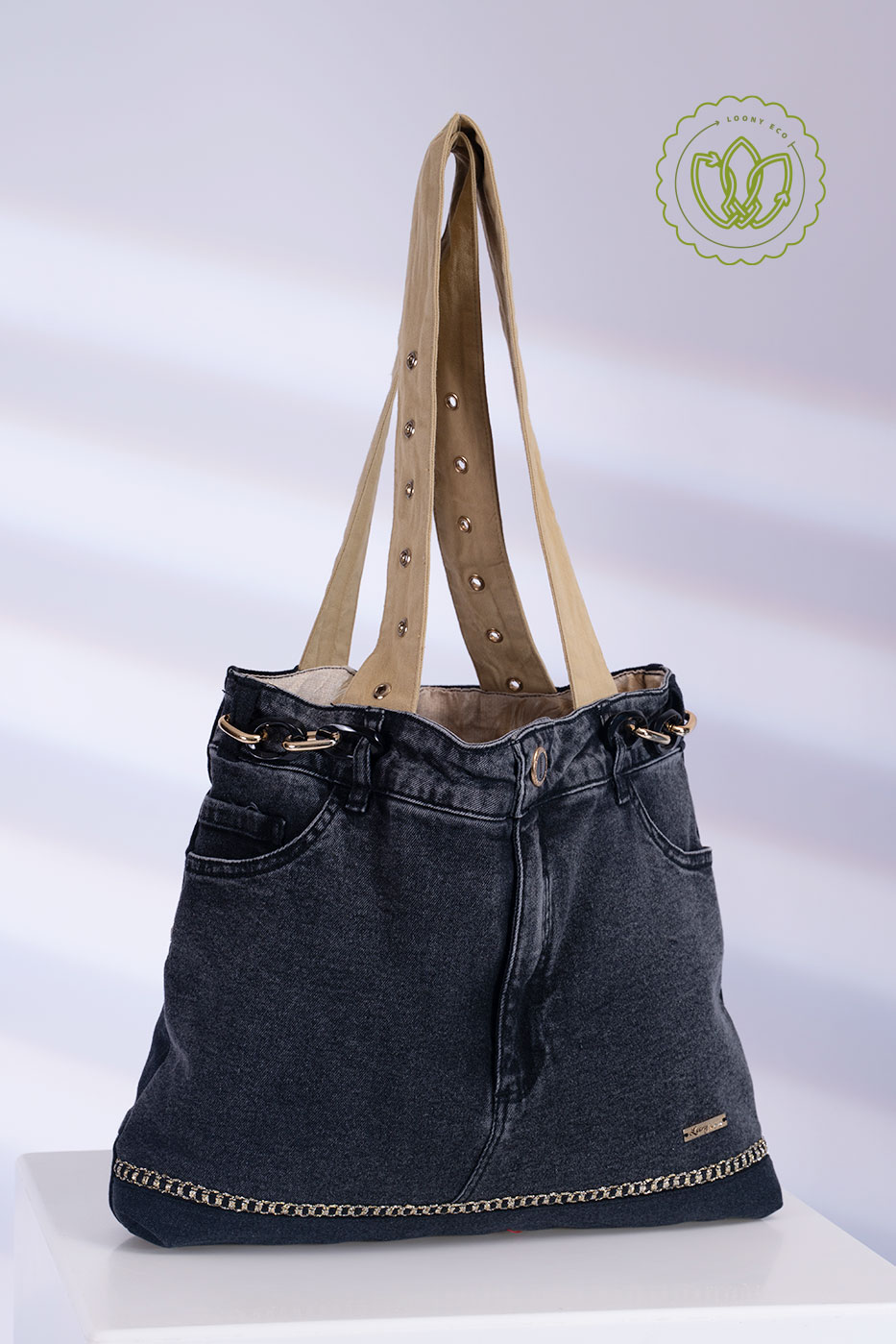 Bolsa feita a partir de cintura e bolsos de jeans preto lavado, com alças largas em tom areia com ilhoses e detalhe de corrente na barra. Upcycling exclusivo, resistente e estiloso para o dia a dia.