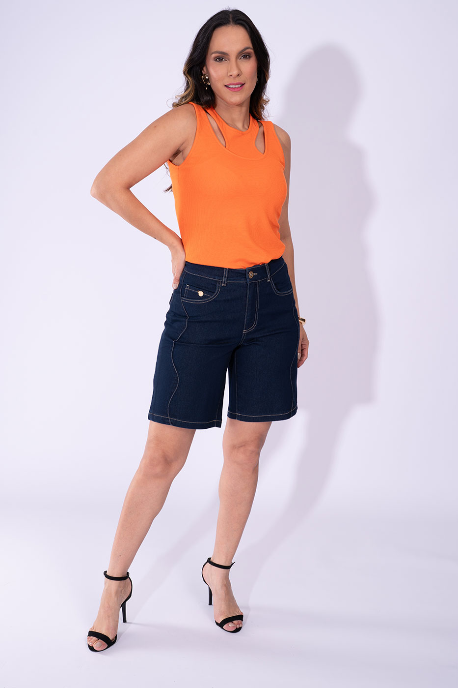 Cós com passantes, fechamento por zíper e botão metalizado, pespontos aparentes e overlock interno; bainha reforçada