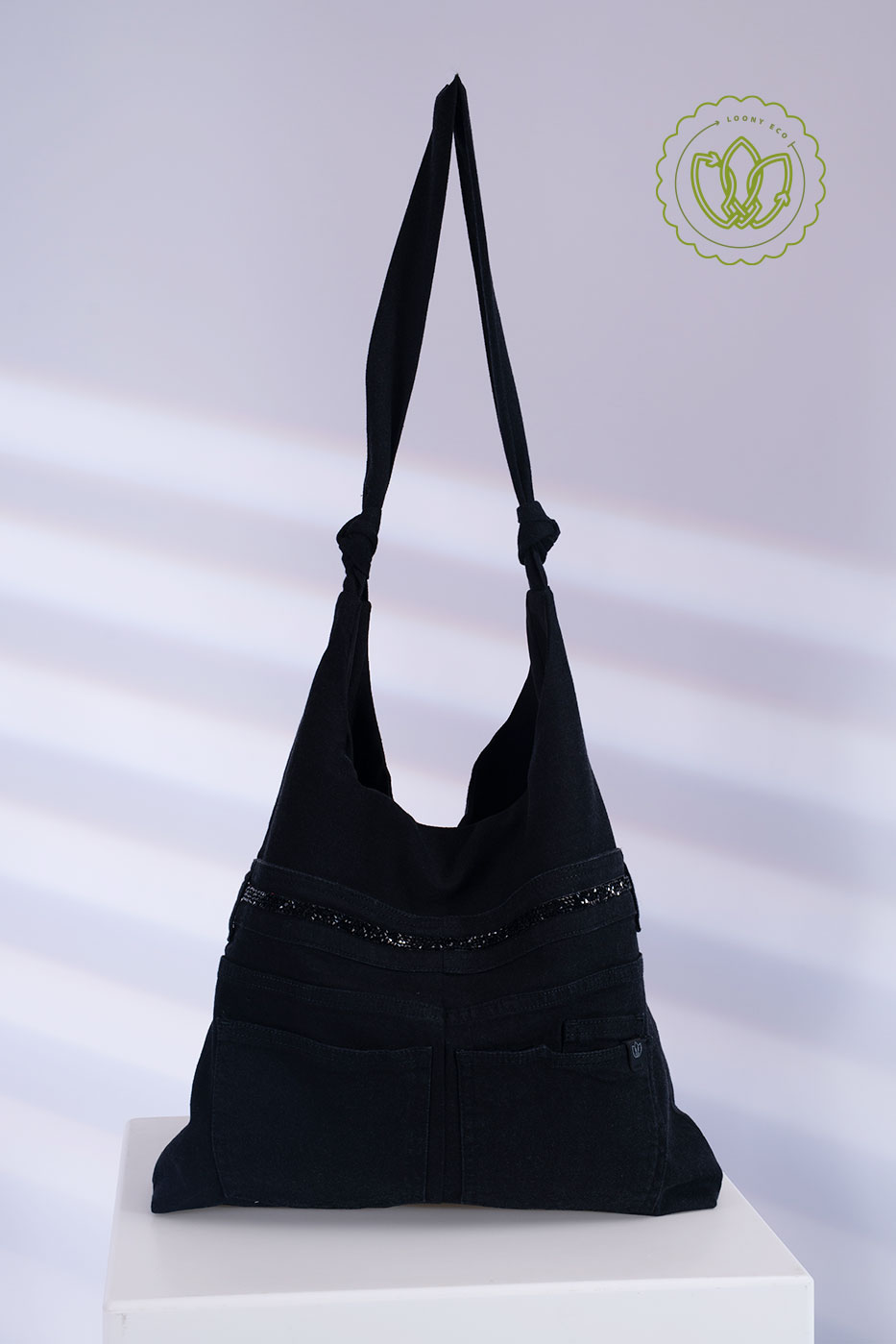 Hobo em jeans preto reaproveitado, com alça ajustável por nós, faixa com brilho na pala e bolsos frontais funcionais. Upcycling exclusivo — leve, prático e resistente para o dia a dia.