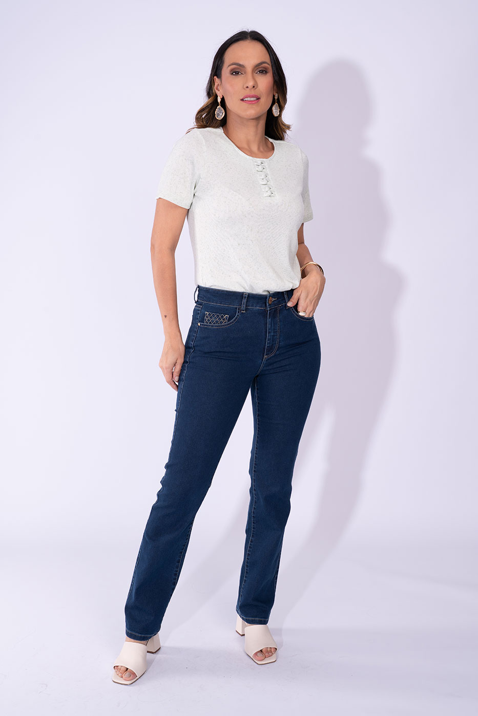 Tecido blend denim (algodão/poliéster/elastano), toque firme com leve elasticidade e boa recuperação