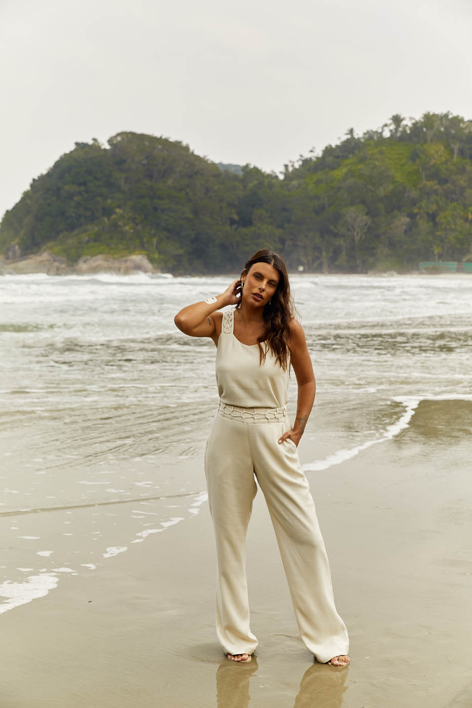 Bainha clean; pala traseira e bolsos frontais discretos; pregas sutis para melhor caimento