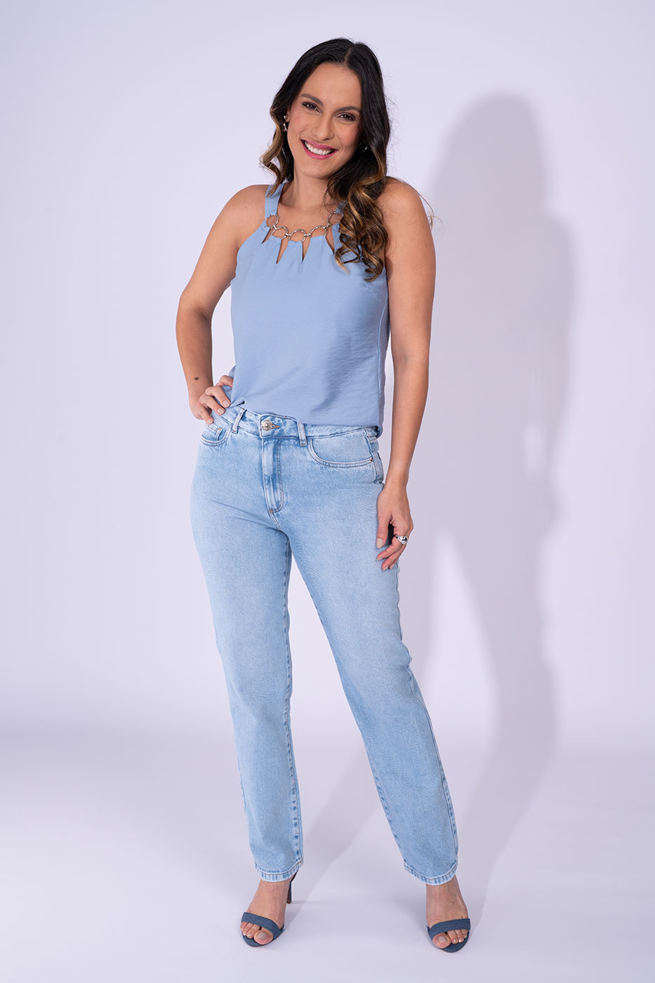 Cós alto com passantes, fechamento por zíper e botão metálico, pespontos duplos e bainha limpa
