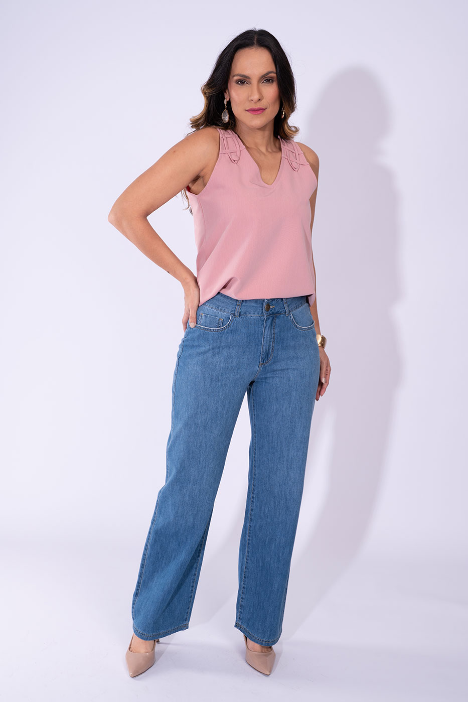 Cós com passantes, fechamento por zíper e botão metálico, costuras reforçadas e bainha limpa