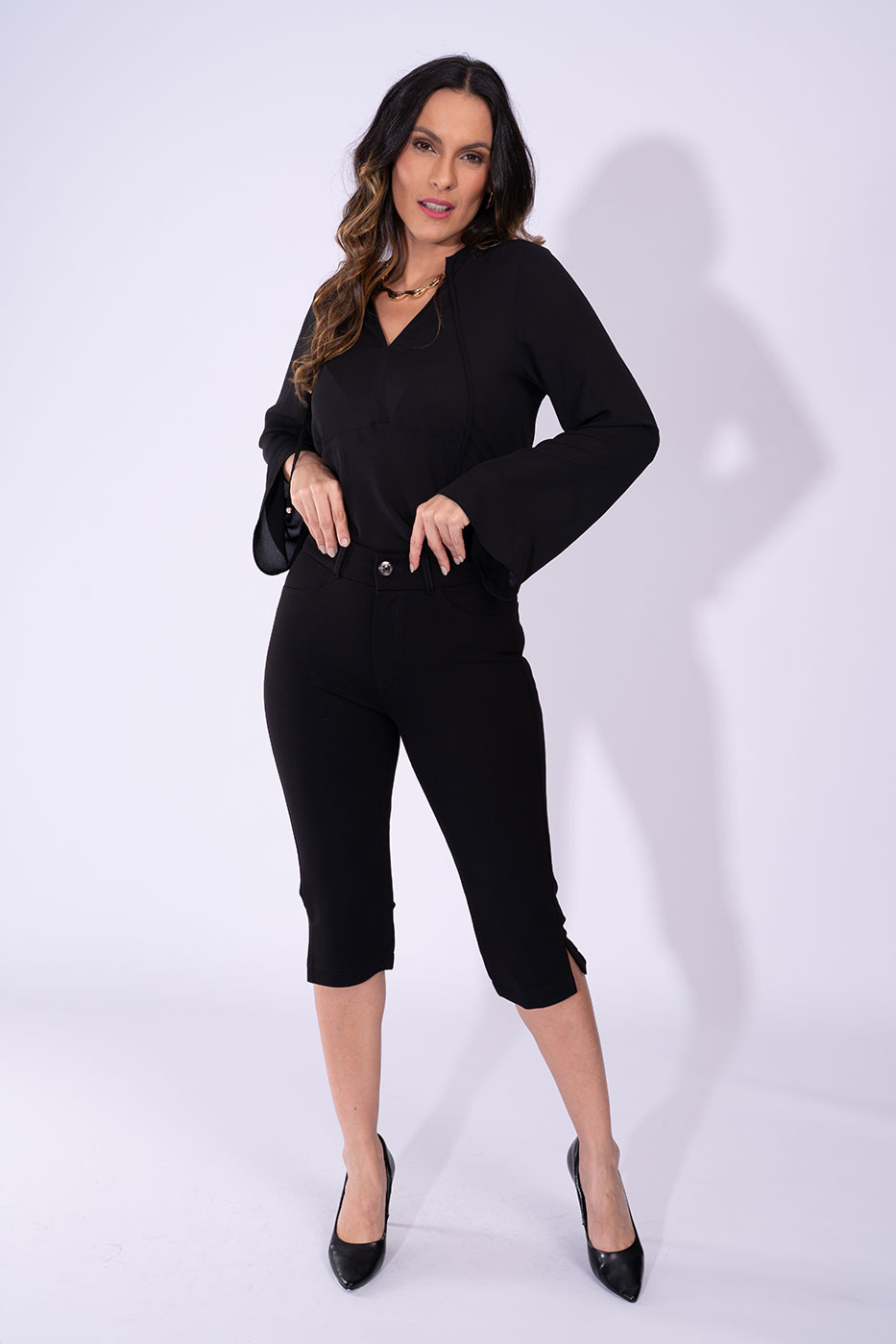 Corsário Roma de caimento justo e comprimento capri, pensado para uso diário com toque sofisticado. A malha mistura viscose, poliamida e elastano oferece toque macio, boa respirabilidade e elasticidade para ajuste confortável. Cós confortável e construção sem abrasões garantem uso prolongado, enquanto costuras planejadas mantêm a peça alinhada ao corpo. Versátil para atividades leves ou composições casuais com sobreposições.