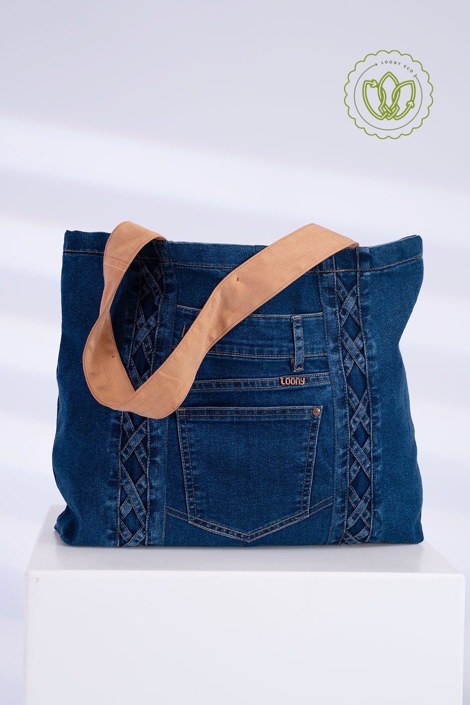 Descrição: Shopper ampla em jeans azul-escuro reaproveitado, com detalhes de tranças verticais nas laterais, bolso traseiro funcional e alça confortável em tom caramelo. Upcycling resistente e versátil para a rotina.