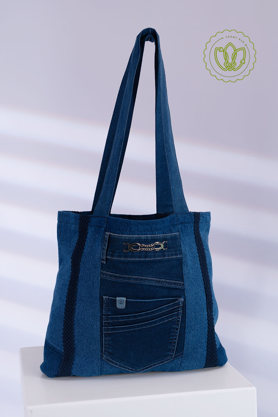 Tote em jeans azul reaproveitado com painel frontal de bolsos, detalhe metálico de corrente no cós e faixas laterais em trama/galão. Alças largas e estrutura macia. Upcycling resistente e versátil para a rotina.