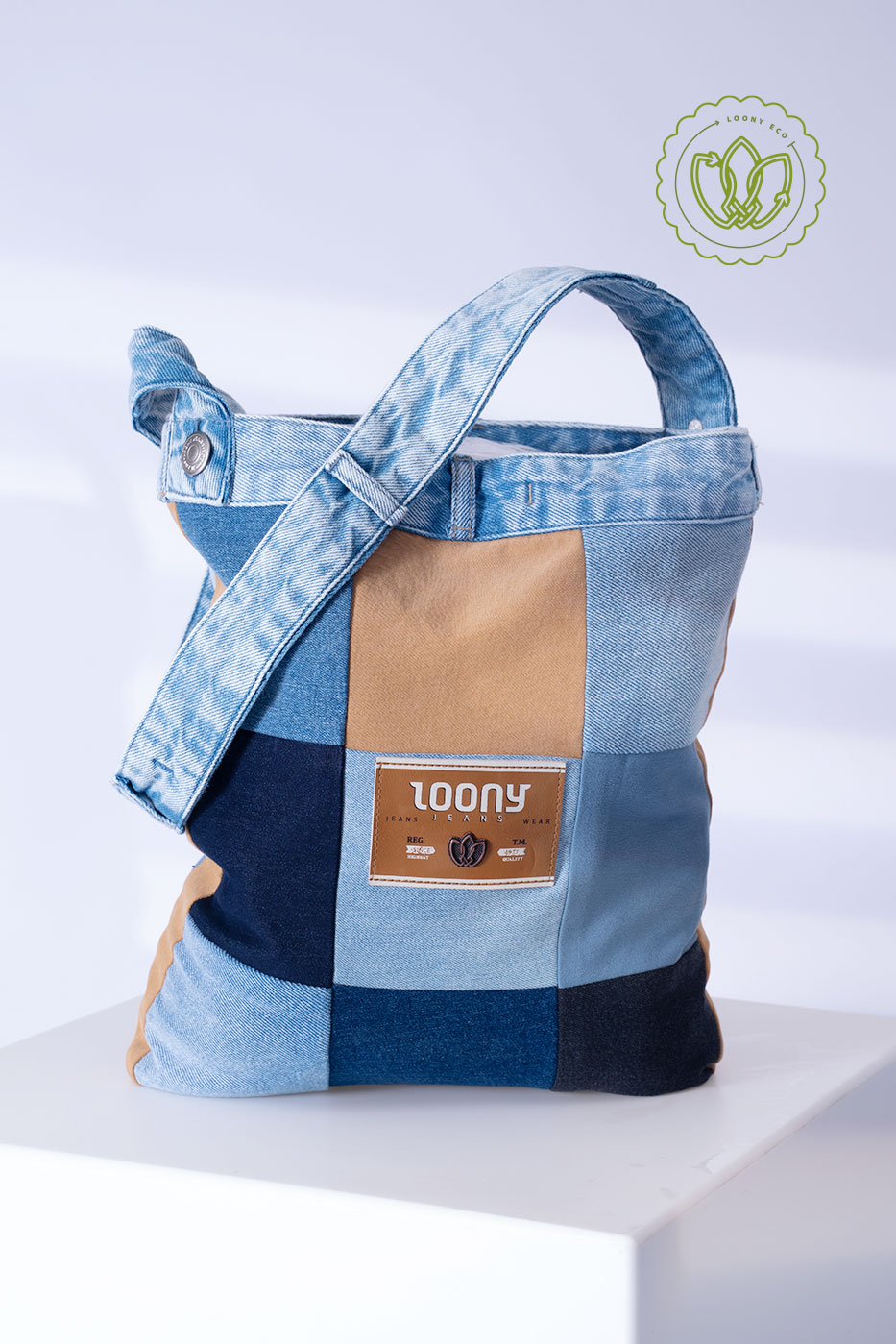 Bolsa em patchwork de quadrados de jeans nos tons azul e caramelo, com alça estruturada feita a partir de cós claro com botão. Peça única de upcycling — espaçosa, resistente e perfeita para a rotina.
