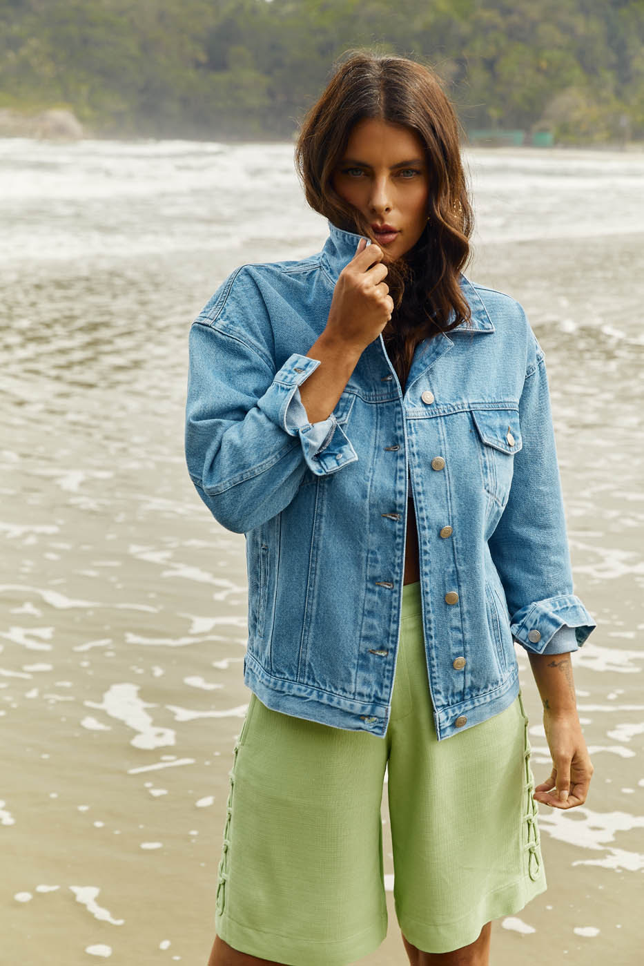 Pespontos contrastantes, costuras flat-felled e overlock interno, botões metálicos e barras pespontadas