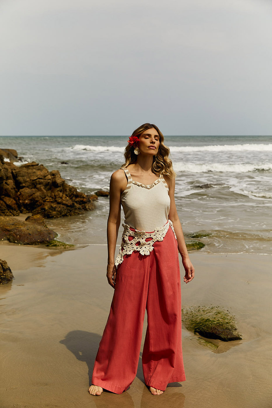 Pantalona ampla em mistura natural que une elegância e conforto para composições sofisticadas. O corte fluido e o comprimento 82 cm proporcionam movimento amplo e caimento leve, valorizando a silhueta sem marcar. Cós estruturado e construção cuidadosa mantêm a peça alinhada, enquanto a composição com linho confere aspecto texturizado e respirabilidade. Detalhes funcionais e acabamentos reforçados entregam um produto durável e versátil para looks do dia e eventos casuais.