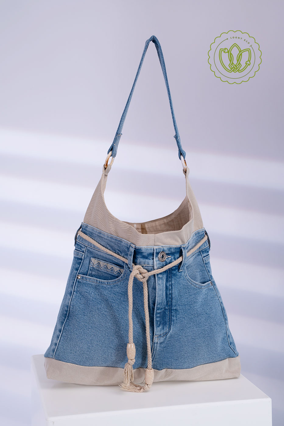 Hobo feita a partir do cós de jeans claro com detalhes em sarja bege e fechamento por cordão de algodão com ponteiras. Alça de ombro com argolas. Peça única de upcycling — leve, espaçosa e com pegada boho.
