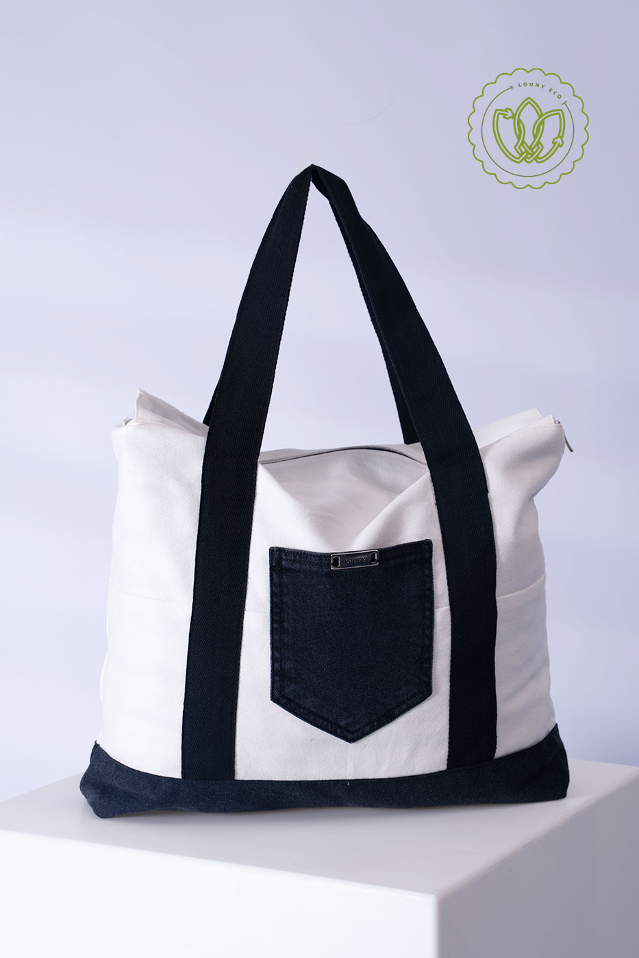 Shopper ampla em canvas branco com detalhes em jeans preto reaproveitado — alças largas, bolso frontal funcional e fechamento em zíper. Upcycling elegante para a rotina.