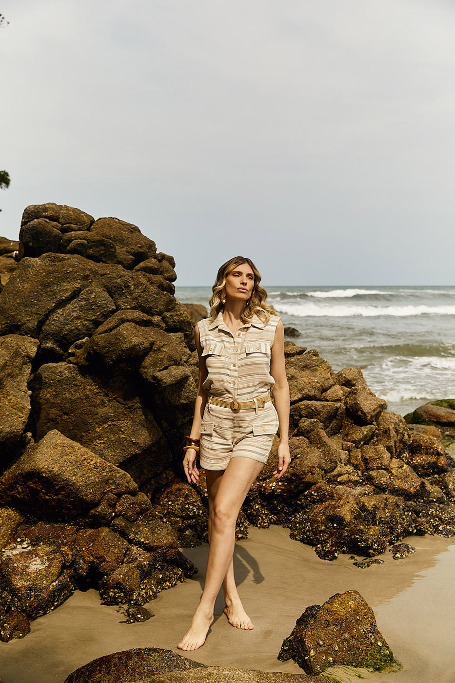 Cós com elástico interno, bainha com pesponto, costuras overlock internas e reforço nos pontos de tensão