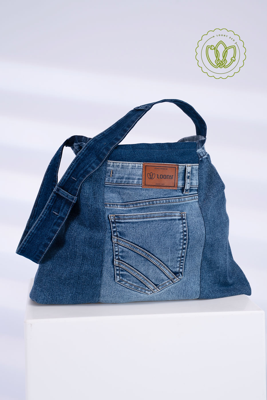 Hobo em patchwork de jeans médio/clarinho com bolso traseiro aplicado em destaque, etiqueta em couro reaproveitada e alça larga confortável. Peça única de upcycling — leve, resistente e perfeita para o dia a dia.