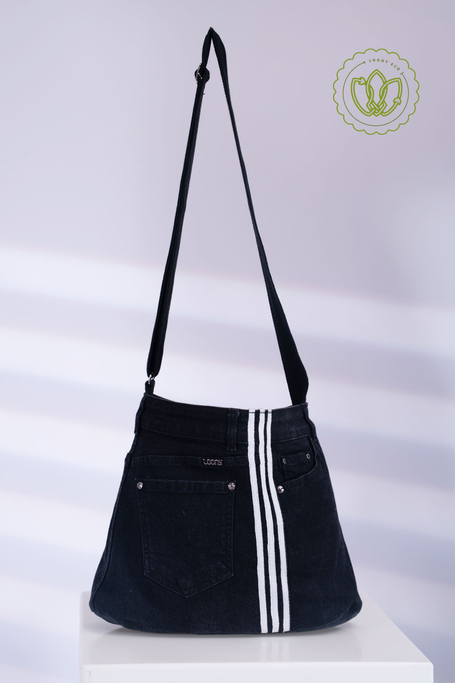 Hobo em jeans preto reaproveitado, com cós e bolso traseiro aparentes e detalhe de três faixas brancas verticais. Alça longa regulável. Upcycling urbano, leve e resistente para o dia a dia.